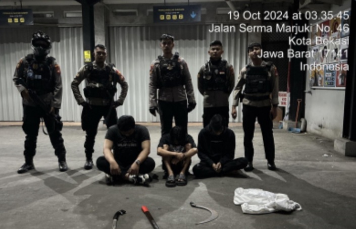 Bekasi Kota , – Tim Perintis Presisi Polres Metro Bekasi Kota berhasil menggagalkan aksi tawuran dan mengamankan tiga pelaku beserta sejumlah senjata tajam di Jalan Serma Marzuki, Kelurahan Marga Jaya, Kecamatan Bekasi Selatan, Sabtu (19/10/2024) dini hari.