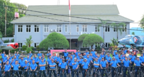 Olahraga bersama dimulai dengan sepeda santai dengan rute mengelilingi area luar Lanud Sultan Hasanuddin, dilanjutkan dengan senam bersama yang dipimpin oleh instruktur profesional. Seluruh anggota Lanud Sultan Hasanuddin terlihat antusias mengikuti gerakan senam yang penuh semangat. Kegiatan olahraga diakhiri dengan pertandingan voli antar anggota, serta olahraga lainnya guna mempererat kebersamaan di antara seluruh personel. (Pen Hnd/Diana)