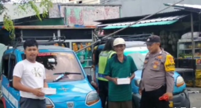 Pembagian nasi sebagai bentuk kepedulian Polri dan rasa empati kepada mereka pejuang nafkah sopir Kancil yang sedang mangkal menunggu penumpang yang setiap hari bekerja dijalanan.