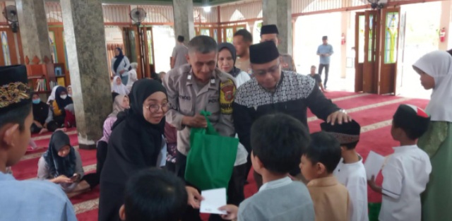 Sorotkeadilan.id -Bekasi Barat, Bhabinkamtibmas Kotabaru Aiptu Ratmoko bersama Tim Safari Ramadhan Kecamatan Bekasi Barat memberikan santunan kepada anak yatim di Masjid Al-Muhajirin Perum Bintara Jaya II RT.04 RW.05 Kelurahan Bintara Jaya Kecamatan Bekasi Barat Kota Bekasi.Jumat.(14/3-2025).