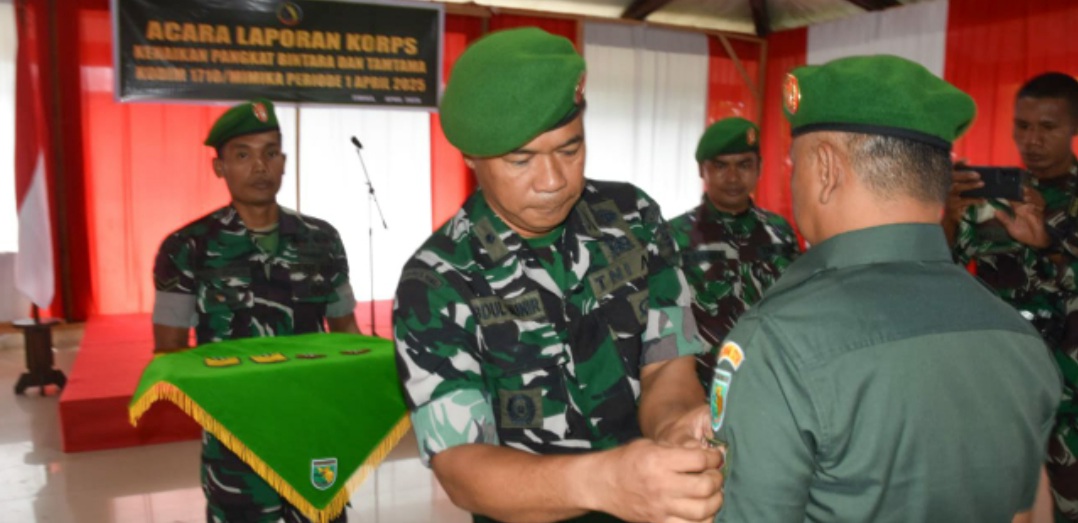 Sorotkeadilan.id – Timika, Sebanyak 15 personel anggota Kodim 1710/Mimika menerima kenaikan pangkat satu tingkat lebih tinggi dari pangkat sebelumnya dalam upacara yang digelar secara khidmat di Pendopo Darmawangsa Kodim 1710/Mimika, Jalan Agimuga Mile 32, Distrik Kuala Kencana, Kab. Mimika. Selasa (8/4/2025).