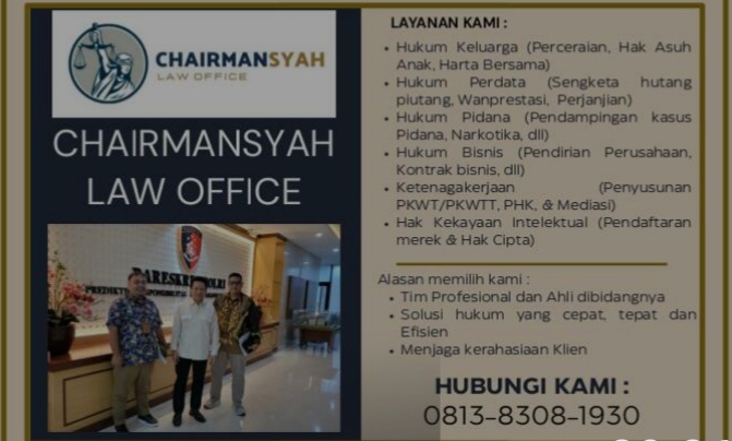 “Kami berkomitmen untuk memberikan pendampingan hukum yang tidak hanya kuat secara yuridis, tetapi juga memberikan ketenangan dan kepastian bagi setiap klien,” ujar tim Chairmansyah Law Office.